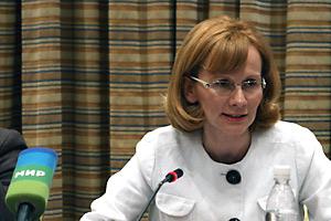 Radmila Sekerinska, head of the OSCE/ODIHR Election Observation Mission in Kyrgyzstan, speaks at a press conference in Bishkek on 15 June 2009.