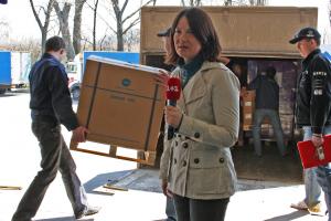 A journalist from TV channel 1+1 reports on the handover of IT equipment provided by the OSCE Project Co-ordinator in Ukraine to support the establishment of a State Voter Register, Kyiv, 7 April 2009.