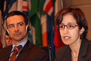 Politico-Military Counsellor Loic Simonet of France listens as the OSCE Senior Adviser on Gender Issues, Jamila Seftaoui, delivers a speech to the OSCE Forum for Security Co-operation. 1 April 2009, Vienna.
