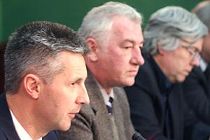 Artis Pabriks, head of the OSCE/ODIHR Election Observation Mission to Montenegro (left), speaks to journalists at a joint post-election press conference with Roberto Battelli, head of the OSCE Parliamentary Assembly delegation (centre), 30 March 2009.