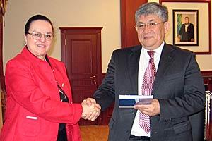 Jeannette Kloetzer (l), Deputy Head of the OSCE Centre in Astana, presents Krymbek Kusherbayev, Governor of the Mangystau region, with a Kazakh translation of the Helsinki Final Act and the Charter of Paris, Astana, 9 April 2009.