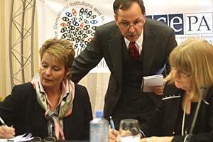 Pia Christmas-Møller, OSCE Parliamentary Assembly Vice-President and Special Coordinator of the short-term observers (left) and Peter Eicher, head of the OSCE/ODIHR long-term observation mission, before their post-election press conference, 23 March 2009.