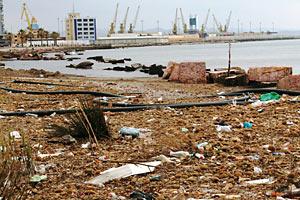 Plastic waste polluting the shores of the harbour city of Durres, Albania, March 2009