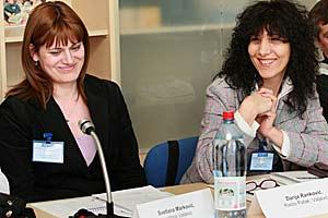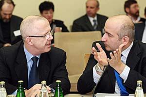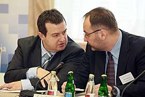 Minister of Interior, Ivica Dacic (left), and Ombudsman Sasa Jankovic, exchange notes at an OSCE-organized conference on preventing torture in Serbia, Belgrade, 23 March 2009.