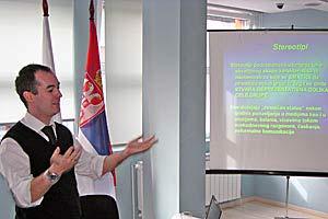 Dejan Pralica from the Novi Sad University gives a lecture at an OSCE-organized seminar on media reporting on religious diversity in the media, Novi Pazar, 31 October 2008.