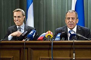 Russian Foreign Minister Sergey Lavrov (Right) with OSCE Chairman Alexander Stubb, at a news conference following their talks in Moscow, 11 November 2008.