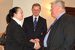 Ireland's Garda Siochana Ombudsman, Kevin Haugh (r), Head of Garda Siochana's Staff Support Unit, John Brosnan (c), and Deputy Head of the OSCE Centre in Astana, Jeannette Kloetzer, at a meeting on democratic policing in Almaty, 13 November 2008.