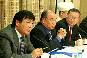 Kyrgyz Parliamentarian Ibragim Junusov (left), State Secretary Nur uulu Dosbol (centre) and Head of the State Agency for Religious Affairs (SARA), Kanybek Osmonaliev, at a meeting on religious freedom in Kyrgyzstan, Bishkek, 11 November 2008.