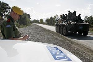 A military monitoring officer from the OSCE Mission to Georgia observes the withdrawal of Russian troops, 8 October 2008.