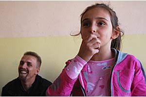 Lisa Beqiri (left) and a classmate from the 'Dardania' primary school at an OSCE project on fire protection education, a pilot project to be implemented in five primary schools in the Prishtine/Pristina region, 10 October 2008.