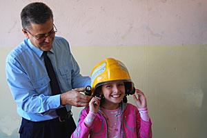 Lisa Beqiri from the 'Dardania' primary school tries on a firefighter's helmet during an OSCE project on fire protection education, to be implemented in five primary schools in the Prishtine/Pristina region, 10 October 2008.