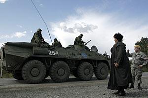 A military monitoring officer (right) from the OSCE Mission to Georgia photographs the withdrawal of Russian troops, 8 October 2008.