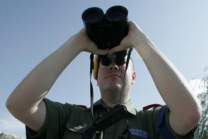 A military monitoring officer from the OSCE Mission to Georgia observes the withdrawal of Russian troops, 8 October 2008.