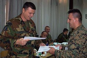 Signed agreements are exchanged during the 300th mission and 600th inspection under the Dayton Agreement on Sub-Regional Arms Control, which were carried out by Croatia in Bosnia and Herzegovina, from 22-28 September 2008.