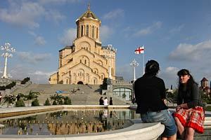 Girls sit near the St. Trinity Church in Tbilisi, 10 May 2008, the largest church in Georgia.