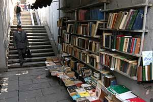A man walks past books on sale in an underpass in Tbilisi, 7 May 2008.