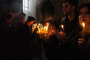 Worshipers hold candles during the day of St. George, inside Kashveti church in Tbilisi, 6 May 2008.