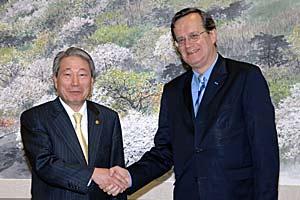 OSCE Secretary General Marc Perrin de Brichambaut (right) with South Korean Foreign Minister Yu Myung-hwan in Seoul, 29 April 2008.