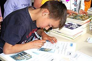 A child from Kadri Bistrica primary school in Bistrice/a village, Leposavic/Leposaviq municipality, registers to receive a book brought to his school by the Mission in Kosovo-supported Library Bus project, 23 April 2008.