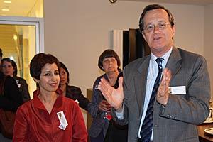 OSCE Secretary General Marc Perrin de Brichambaut speaks to participants of an annual meeting of gender focal points at the Secretariat in Vienna, 31 March 2008. On the left is Jamila Seftaoui, Senior Adviser on gender issues.