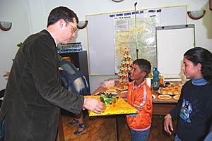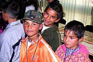 Bernd Burwitz, Head of the OSCE Regional Centre in Peje/Pec, presents a prize to one of the Roma schoolchildren who took part in a drawing contest organized by the Mission in Kosovo to mark International Roma Day, 7 April 2008.