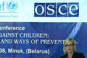 OSCE Special Representative for Combating Trafficking in Human Beings, Eva Biaudet, delivers her opening speech at the "Violence against children" conference, Minsk, Belarus, 9 April 2008.