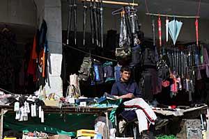 A vendor selling commercial goods awaits customers at the central market in Dushanbe, 26 February 2008.