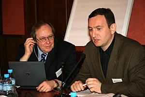 Alexander Boldyrev (left), Senior Adviser to the OSCE Representative on Freedom of the Media, and David Paichadze, Director of the Journalism Department of the Tbilisi State University, at a training seminar in Tbilisi, 18 March 2008.