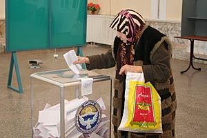 A voter casts his ballot in the town of Kant, Kyrgyzstan, during the pre-term parliamentary elections, 16 December 2007.