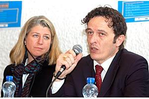 Kosovo's Acting Ombudsperson Hilmi Jashari (right) expresses his view at an employment fair supported by the Mission in Kosovo, Prishtine/Pristina, 5 December 2007. The OSCE's Melissa Stone is on the left.