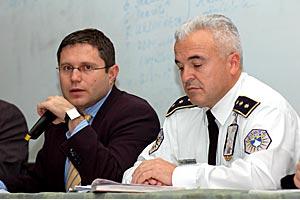 Kosovo Police Colonel Rifat Marmullaku (right) and Burim Ramadani from the provisional Ministry of Internal Affairs talk to Prishtina University students at a debate organized by the OSCE Mission in Kosovo, Prishtine/Pristina, 4 December 2007.