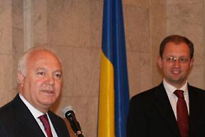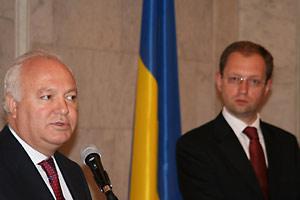 OSCE Chairman-in-Office and Spanish Foreign Minister, Miguel Angel Moratinos (left), at a press conference with Ukrainian Foreign Minister, Arseniy Yatsenyuk, during the 16th Annual Session of the OSCE Parliamentary Assembly in Kyiv, 5 July 2007.