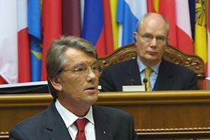 Ukrainian President Viktor Yuschenko addresses the Plenary Session of the OSCE Parliamentary Assembly in Kyiv on 5 July 2007. On the right is the OSCE PA President, Goran Lennmarker.