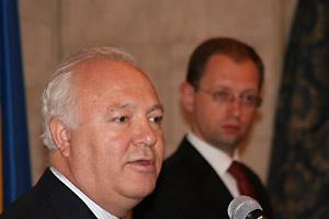 OSCE Chairman-in-Office and Spanish Foreign Minister, Miguel Angel Moratinos (left), at a press conference with Ukrainian Foreign Minister, Arseniy Yatsenyuk, during the 16th Annual Session of the OSCE Parliamentary Assembly in Kyiv, 5 July 2007.