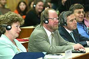 (L-R) IFA President Ursula Seiler, Head of Mission Ambassador Hans Ola Urstad, Head of the EC Delegation to Serbia Joseph Lloveras, and German Ambassador to Serbia Andres Zobel at the opening of the "EU Youth Parliament" project, Novi Sad, 18 May 2007.