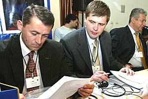 Participants exchange notes at an OSCE Mission to Serbia-organized conference on drug trafficking-related money laundering and asset seizure, Belgrade, 24 May 2007.