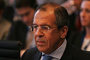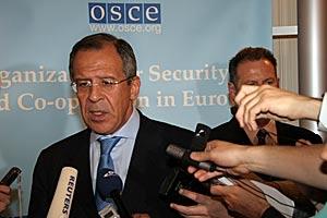 Russian Foreign Minister Sergey Lavrov (left) delivers a speech to the OSCE Permanent Council, in Vienna 23 May 2007, as Ambassador Alexey Borodavkin looks on.