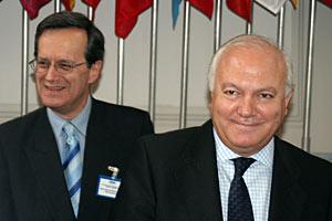 OSCE Chairman Miguel Angel Moratinos (right) and Secretary General Marc Perrin de Brichambaut in Prague, 21 May 2007.