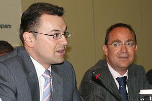 The Director of the State Administrative Inspectorate, Dimitar Georgievski (left) and the Head of the OSCE Mission to Skopje's Public Administration Reform Unit, Philip Stiel, at a conference in Skopje on improving public administration, 15 May 2007.