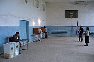 Voters cast their balots at a polling station set up in a school gymnasium, in a mountain village, near Martuni, Lake Sevan, during parliamentary elections in Armenia, 12 May 2007.