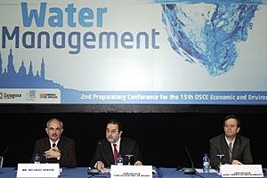 OSCE Secretary General Marc Perrin de Brichambaut (r), Ambassador Carlos Sanchez de Boado of Spain (c) and Deputy Mayor of Zaragoza Ricardo Berdie, second preparatory conference for the 15th OSCE Economic and Environmental Forum, Zaragoza, 12 March 2007.