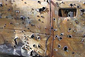 A bullet-ridden car at a military training facility in Hammelburg, Germany, April 2007.