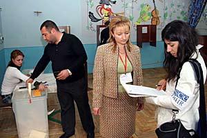 An ODIHR election observer speaks with an official at a polling station in Yerevan during parliamentary elections in Armenia, 12 May 2007.