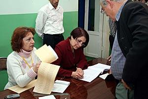 Polling station officials hand out a ballot paper during parliamentary elections in Armenia, 12 May 2007.