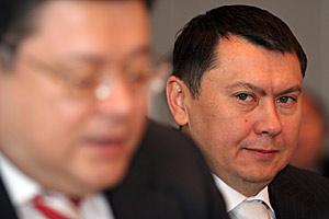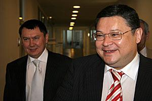 Kazakh Foreign Minister Marat Tazhin (right) with Ambassador Rakhat Aliyev before speaking to the OSCE Permanent Council in Vienna, 30 April 2007.