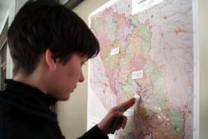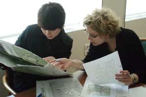 Masa Janjusevic (Serbia) and Lia Lockert (USA) study their area of responsibility during a briefing for long-term election observers ahead of the 3 June 2007 local elections in Moldova.