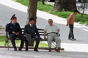 Two police officers and a man resting on a park bench in Dushanbe, 14 April 2007.