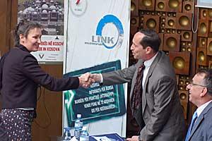 Wilma Theuws (left), of the OSCE Mission in Kosovo, shakes hands with Lawrence Corwin from US Office in Kosovo and Pristina University rector Enver Hasani (seated) at the opening of an OSCE-supported Student Services Centre, 24 April 2007.