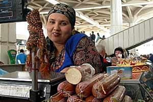 A woman selling sausages at a market in Ashgabat on 12 April, 2007