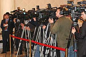 Journalists wait for a news conference with the OSCE Chairman-in-Office, Spanish Foreign Minister Miguel Angel Moratinos, at the Presidential Palace in Astana, on 10 April 2007.